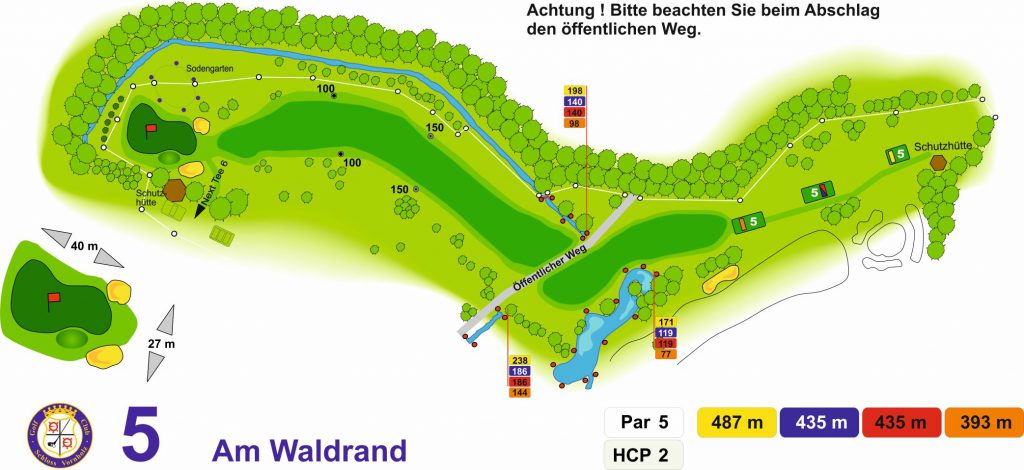 - Zwar nicht neu, aber trotzdem noch einmal der Hinweis auf den öffentlichen Weg, der nun auch eingezeichnet ist. Bitte vor dem Abschlag erhöhte Aufmerksamkeit, dass sich keine Fußgänger, Radler oder Reiter auf dem Weg befinden. Wenn der Ball auf dem öffentlichen Weg liegt, kann straffrei gedroppt werden.
