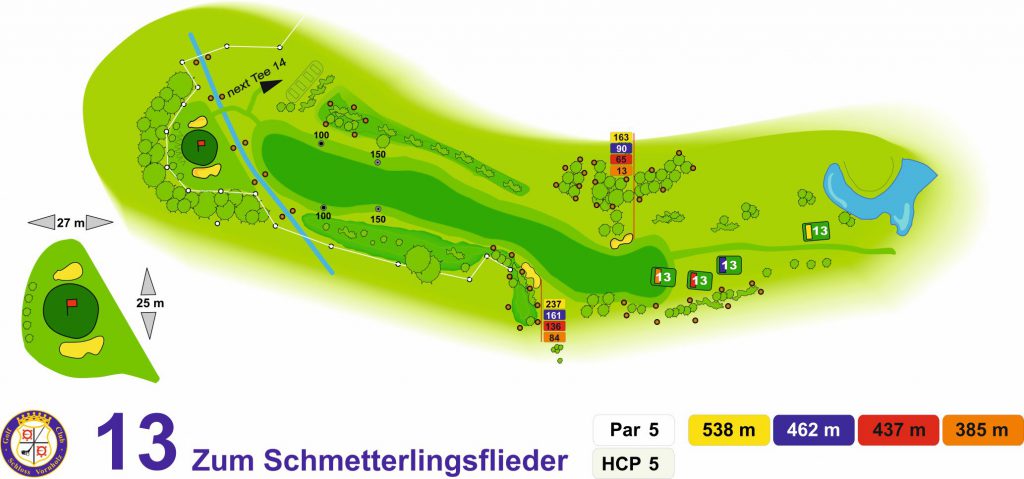 - Hier gibt es mehrere ausdrückliche „Betretungsverbote“ (rot mit grünen Köpfen): Buschwerke sofort links und rechts hinter dem Bunker, sowie hinter dem linken Bunker, rechts hinter der 100m-Markierung und ebenso der vor dem Grün verlaufende Bachlauf.