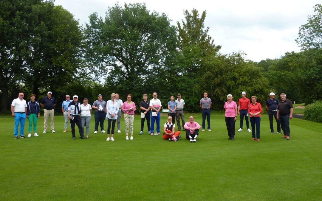 Die Saison der Vierer-Turniere ist in diesem Jahr sehr kurz. Traditionell bildet diese Spielform an Fronleichnam das Ende einer 5-6 Turniere umfassenden Serie, aber in Zeiten von Corona ist alles anders. Dieser Fronleichnam-Vierer war also der erste und einzige des Frühjahrs/Frühsommers und bildete in diesem Jahr gleichzeitig den gelungenen Auftakt der größeren Turniere. Am Dienstag waren bereits die Damen mit 39 Spielerinnen in die Saison eingestiegen, am Mittwoch folgte der Herren-Nachmittag. Fronleichnam stand nun ganz im Zeichen des Vierers mit der Spielform Scramble, bei der beide Spieler des Teams jeweils von der Position des letzten besten Balls aus schlagen dürfen. Insgesamt 84 Spielerinnen und Spieler stellten sich den Herausforderungen einer teilweise sehr sportlichen Fahnenposition bei allerbesten Wetterverhältnissen und sehr guten Bedingungen auf dem Platz. Am Halfway-House erwartete die Teams zur Stärkung belegte Brötchen, Frikadellen und Heiß- und Kaltgetränke auf Einladung des Vereins. Als am Ende des Turniers alle Spieler wohlbehalten im Clubhaus eintrafen und von der Gastronomie verköstigt wurden, war Präsident Wilhelm Linnenbank erleichtert, dass alls notwendigen Hygienemaßnahmen auch bei dieser hohen Teilnehmerzahl eingehalten werden konnten. Diese waren in Abstimmung mit dem Gesundheitsamt und dem zuständigen Ordnungsamt Ennigerloh erfolgt. Die Siegerehrung wurde zwar wie gewohnt launisch vom Vizepräsidenten und kommissarischen Spielführer Reiner Schaefers gehalten, die ansonsten üblichen Umarmungen und Händeschütteln mussten allerdings unterbleiben. Die Preise mussten sich die Sieger und Platzieren außerdem selbst vom Tisch nehmen – noch gewöhnungsbedürftig aber alles gut umsetzbar, um Corona keine weitere Möglichkeit zur Verbreitung zu geben. Das erklärt auch die etwas seltsam anmutende Aufstellung für das Foto der Sieger und Platzierten, um den notwendigen Abstand untereinander zu halten. Geehrt wurden folgende Teams: