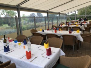 Der Farbenspiel-Vierer feierte in diesem Jahr seine Premiere! Aufgrund der Corona-bedingten Einschränkungen hatten die Initiatoren Christoph Jordan und Reiner Schaefers von einer erneuten Auflage des Oktoberfest-Vierers mit anschließender Clubhaus-Sause Abstand genommen und die Idee des Farbenspiel-Vierers wurde geboren. Um zwölf Uhr starteten 76 Golfer zum Kanonenstart mit der Spielform Chapman-Vierer und der Besonderheit, dass die unterschiedlichen Abschlagsfarben gelb, blau, rot oder orange farblich auf der Scorekarte vorgegebenen waren und teilweise neue Perspektiven auf die Golfbahn boten. Am Halfway-Haus erwartete die Spieler Imbiss und Getränke, die von zwei jungen Damen gereicht wurden. Bei herbstlichen Temperaturen, aber unerwartet trocken entgegen der Wettervorhersage – Ausnahme nur ein kleiner Schauer am Ende der Runde -, kamen die Spieler nach der Runde in bester Stimmung zurück ins Clubhaus. Übrigens: unser Ehrenpräsident Lutz Gössing – Bronzemedaillengewinner Olympische Spiele 1972 im Vielseitigkeitsreiten – hatte sich mit Franke Sloothaak einen Doppel-Olympiasieger im Springreiten 1988 und 1996 als Teampartner ausgesucht. Sloothaak lobte auf der Siegerehrung die sehr guten Platzbedingen und wird auch zukünftig gerne für eine Golfrunde zum Schloss Vornholz kommen.