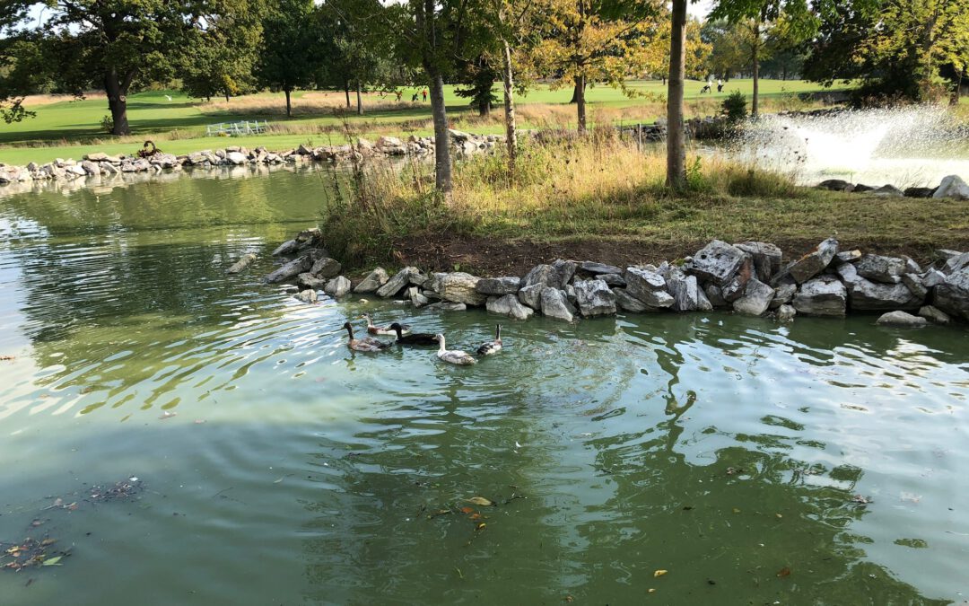 Fünf bunte Laufenten lassen sich seit Samstag bei uns am Teich zwischen der 1 und der 18 beobachten. Hier ein kleines Video von der Freilassung dazu: