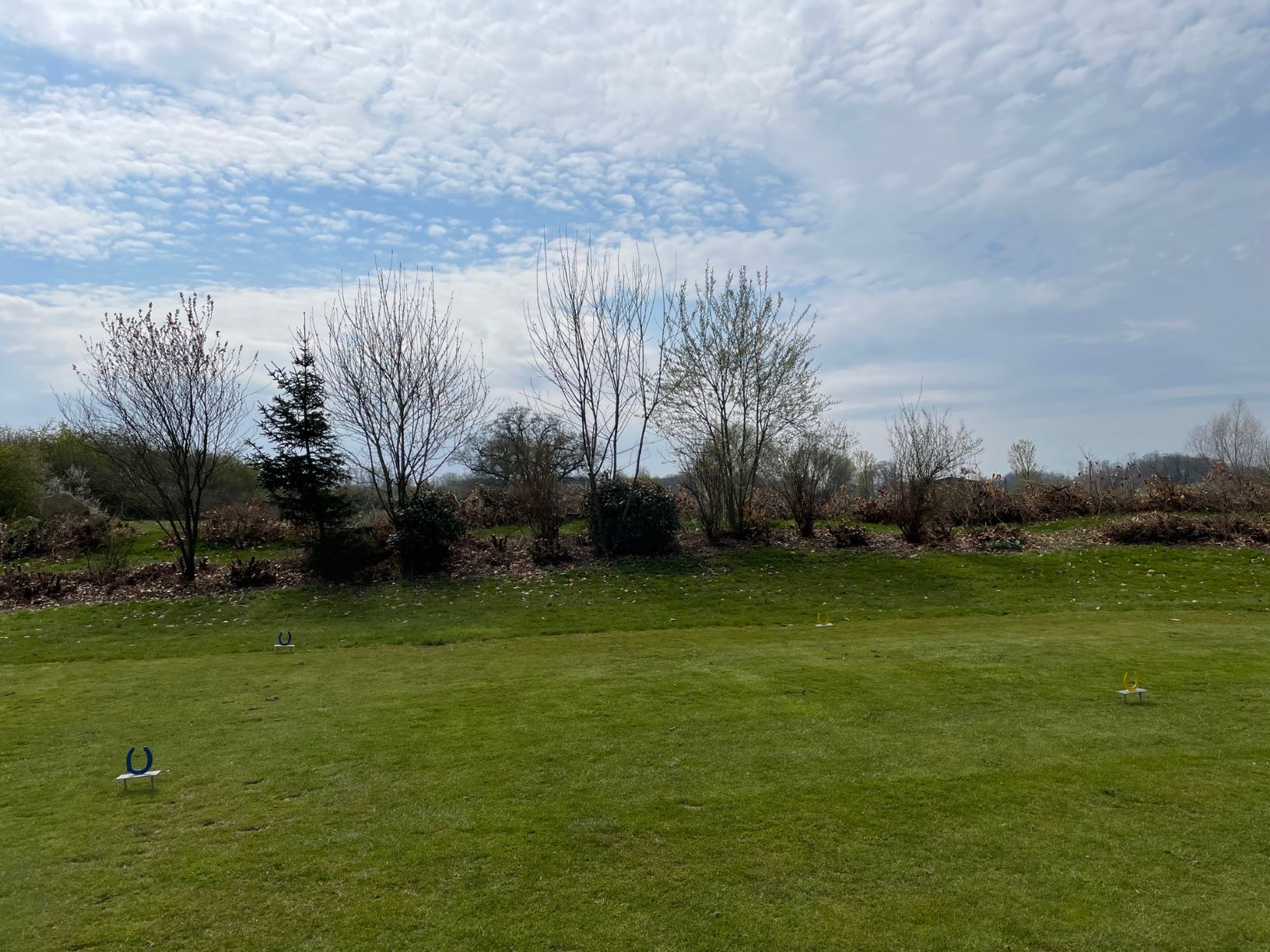 Hier eine Bitte: Trolleys auf dem Weg parken, dann zum Abschlag gehen – und wer einen großen Schritt über die eingesäten Flächen schafft, ist herzlich dazu eingeladen!