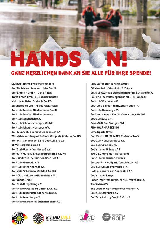 „Hands On! – Hilfe für Hochwasser-Betroffene“ – eine Initiative von Golfclubs und Unternehmen aus der Golfbranche in Deutschland startete am 17. Juli 2021. Bis zum heutigen Tag ist eine Spendensumme von 115.000 € zustande gekommen – aus 56 unterschiedlichen Golfclubs – zu denen auch wir vom Golfclub Schloss Vornholz gehören – und Unternehmen aus der Golfbranche. In einzelnen Clubs laufen aktuell noch Spendenaktionen, vielleicht erhöht sich die Summe noch. Die Tabler vom RT 168 Daun haben mittlerweile entschieden, dass das Geld kurzfristig an stark betroffene Familien ausbezahlt werden soll. Hierfür waren div. Zusagen vom Finanzamt abzuwarten. Zur Situation äußert sich Christopher Thielen (Präsident RT 168 Daun):