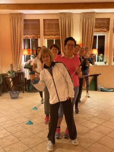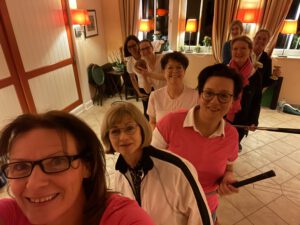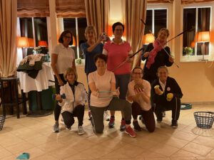 Die Rede ist hier von einem golfspezifischen Fitnesstraining, um körperlichen Defiziten entgegenzuwirken und die eigene Koordination und (Schnell-)Kraft zu verbessern.Inspiriert durch ihre kürzlich erfolgreich abgeschlossene Ausbildung als PGA Pro und die hier gesammelten Erfahrungen hatte unsere Trainerin Iris Wewer im Herbst die Idee, die Damen des GCSV zur Teilnahme an einem zehnwöchigen Kurs einzuladen. Eine Damengruppe nutzt derzeit dieses Angebot und trifft sich einmal pro Woche für eine Stunde im Clubhaus, um gemeinsam unter Anleitung von Iris zu trainieren.In dem Kurs werden nicht nur Übungen gezeigt, sondern es gibt darüber hinaus auch Tipps, Hinweise und Erläuterungen zu golfspezifischen Bewegungen und Körperhaltungen.Ziel des Kurses ist es, den Teilnehmerinnen einerseits Übungen und Bewegungsabläufe zu erläutern, die bei regelmäßiger Ausübung die körperliche Leistungsfähigkeit/Kraft und Beweglichkeit des Körpers erhöhen können, und andererseits die eigene Koordinationsfähigkeit zu verbessern.In spielerisch lockerer Atmosphäre werden nach einem Warm-Up im Kreis zunächst Mini-Parcours‘ mit Hindernissen in Kombination mit kleinen kognitiven Übungen bewältigt. Anschließend folgt ein intensiver Trainingsteil mit diversen Kleingeräten, um die (golfspezifische) Muskulatur gezielt zu trainieren und Impulse zu setzen. Dehnübungen und eine kleine mentale Einheit runden jede Einheit zum Ende ab.Im Rahmen des Kurses soll den Teilnehmerinnen vermittelt werden, wie wichtig eine gut trainierte Muskulatur und Koordination sind – nicht nur auf dem Golfplatz! Viele der Übungen können mit wenig Aufwand und Material auch sehr gut zu Hause ausgeführt werden. Denn nur ein regelmäßiges Training erhöht auf Dauer die eigene Leistungsfähigkeit.Die Kursteilnehmerinnen hoffen den positiven Schwung und die Motivation aus dem Kurs mitnehmen zu können und freuen sich schon sehr auf die kommende Saison. Herzlichen Dank an Manuela Föge für diesen Bericht!