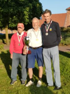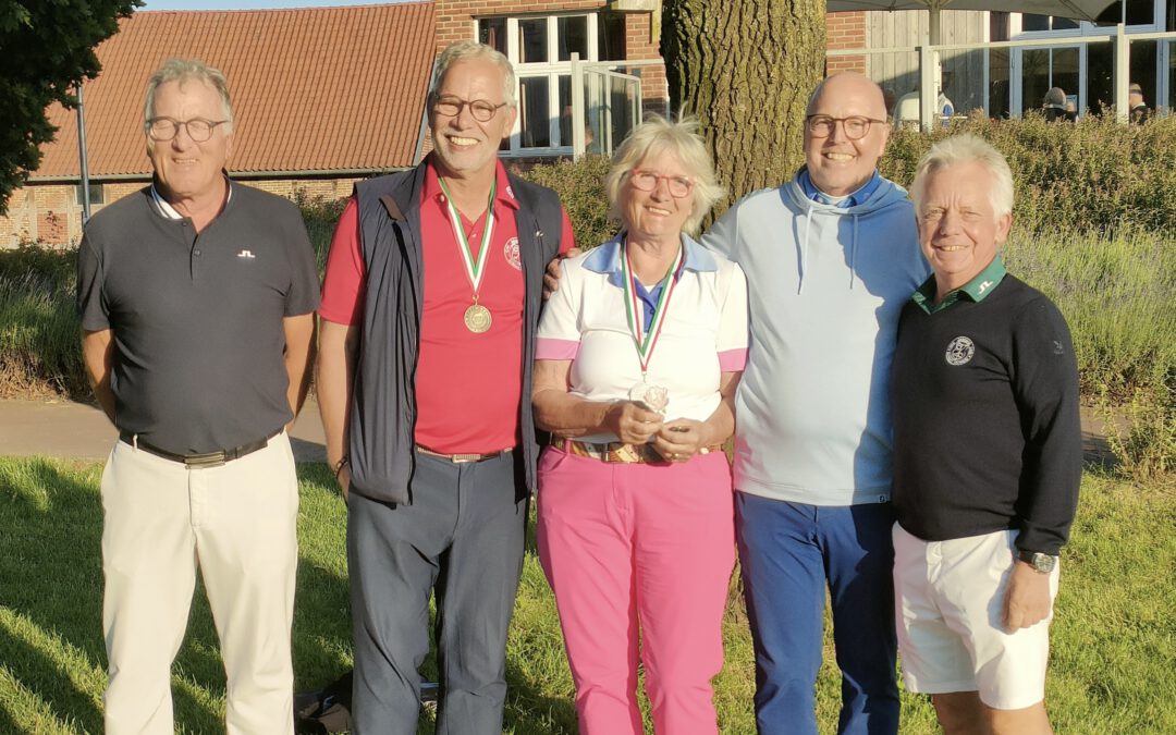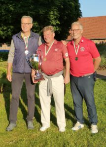 Zum ersten Mal fanden die NRW-Meisterschaften AK 65/75 auf unserer Anlage statt und waren direkt ein voller Erfolg. Nicht nur, dass mit Anna Opitz, Silbermedaille in der Altersklasse 75 der Damen, und Martin Hummels, Bronzemedaille in der Altersklasse 65 der Herren, zwei unserer Mitglieder auf dem „Treppchen“ standen, sondern auch sehr viele Teilnehmer über den Platz begeistert waren. Insgesamt 74 Teilnehmer sind in den Altersklassen AK 65/75 der Damen und Herren an den Start gegangen. Aus unserem Club waren das neben den beiden erwähnten Medaillengewinnern Karl Uphus, Reiner Schaefers und Rudi May. Spannend wurde es für unseren Spielführer Martin Hummels, der sich mit einer ausgezeichneten Runde von 84 Bruttoschläge am Samstag in eine aussichtsreiche Position gespielt hatte. Dies bedeutete zunächst Rang sechs. Mit einer noch besseren Runde am Sonntag von 82 Bruttoschlägen konnte er sich sodann Rang 3 sichern. Spannender wurde es bei den Plätzen eins und zwei. Nachdem er sich am Samstag noch mit 76 Schlägen vom Verfolgerfeld absetzen, brachte Dr. Frank Schindelhauer von unserem Nachbarclub Brückhausen „nur“ eine 84 ins Clubhaus, so dass Ulrich Schulte vom Bochumer GC ihn mit einer 77 abfangen und ein Stechen erzwingen konnte. Die beiden ersten Extralöcher wurden geteilt, beim dritten Extraloch hatte Ulrich Schulte das Momentum auf seiner Seite und holte die Goldmedaille in der Altersklasse 65. Bei den Damen der Altersklasse AK 65 setzte sich Helga Schmidt vom GC Wasserburg Anholt mit einem Schlag Vorsprung und einem ausgezeichneten Ergebnis von insgesamt 163 Schlägen vor ihren Verfolgerinnen Pia Wunderlich vom GC Kürten und Paula Mielke -Salzmann Vom GC Hünxerwald durch. Die Goldmedaille in der Altersklasse der Damen AK 75 gewann souverän Karin Müller vom GC Teutoburger Wald. Bei den Herren AK 75 machte es Waldemar Krüger wie sein Clubkollege vom Bochumer GC und gewann mit 169 Schlägen die Goldmedaille, vor Rolf Greve vom Bielefelder GC mit 171 Schlägen und Ulrich Wittkämmper vom GC Issum-Niederrhein mit 175 Schlägen. Bei den Damen AK 75 gewann Karin Müller vom GC Teutoburger Wald mit 189 Schlägen vor Anna Opitz mit mit 217 Schlägen. Herzlichen Glückwunsch an alle Medaillengewinner! Gute Platzierungen konnten auch die weiteren Teilnehmer unseres Clubs Karl Uphus, Rudi May und Reiner Schaefers erzielen. Die einzelnen Ergebnisse können Sie hier einsehen. Vor der Siegerehrung begrüßte Präsident Wiili Linnenbank die Teilnehmer und dankte für ihr zahlreiches Erscheinen. Die Siegerehrung übernahm sodann Lennart Horn vom Golfverband NRW. Er hob die gute Zusammenarbeit im Vorfeld des Turniers mit unserer Clubmanagerin Nataly Remmel hervor, bedankte sich beim Greenkeepingteam für die perfekte Vorbereitung des Platzes und der Gastronomie für die kulinarische Versorgung der Teilnehmer. Ferner dankte er den ehrenamtlichen Richtern, den Herren Dorozala und Kirchner, für die Klärung der ein oder anderen Regelfrage Vorort. Unser Dank gilt außerdem Dr.Ursula Neckel, Benedikt Wiemeyer, Manfred Mix und Marie Luise Bußmann, dass sie als Starter im Einsatz waren. Im Anschluss an die Übergabe der Medaillen und Pokale klang der Abend in geselliger Runde auf der Clubterrasse aus.